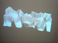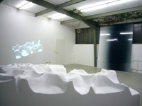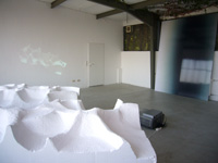 | eno henze - die ganze welt an einem tag, installation, 2 styroporskulpturen jeweils ca. 2,5x1x1m, videoprojektion, 2007 |